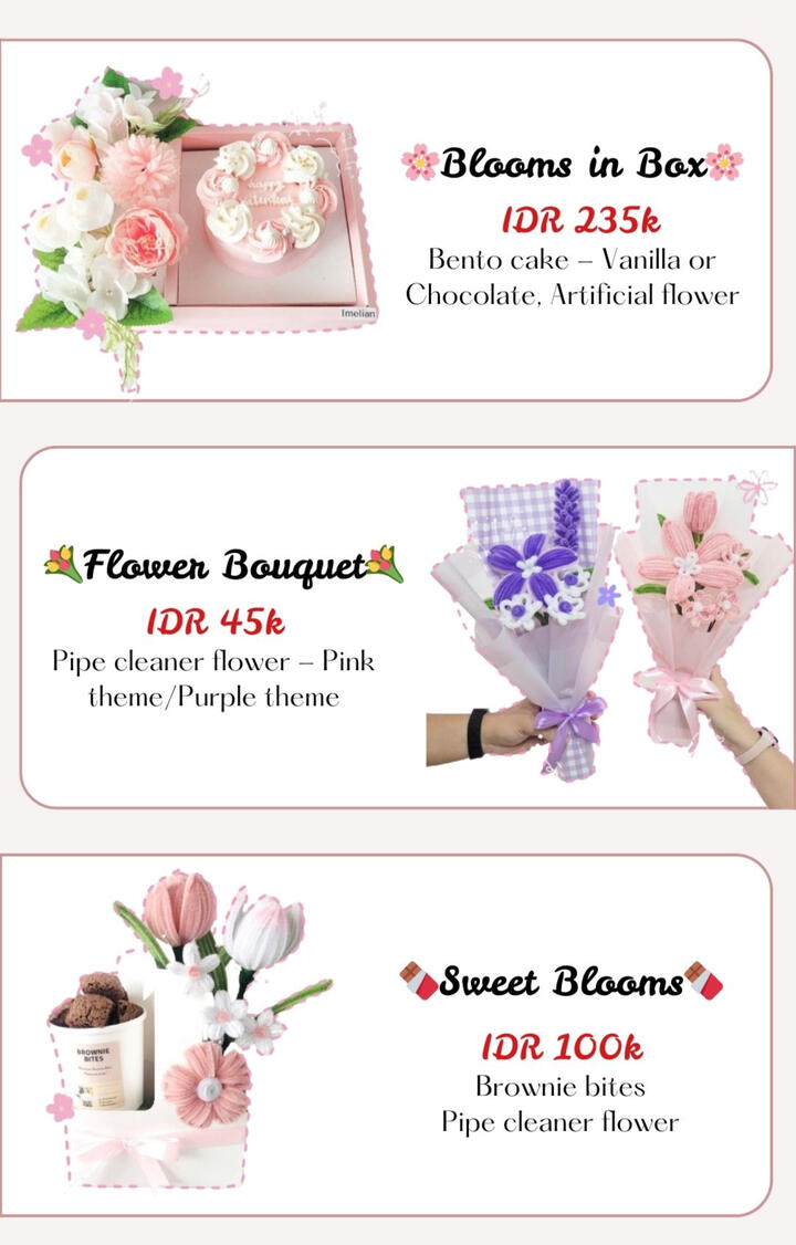 A : Imelian bouquet adalah sister brand dari imelian yang menyediakan buket bunga custom dengan beragam varian.